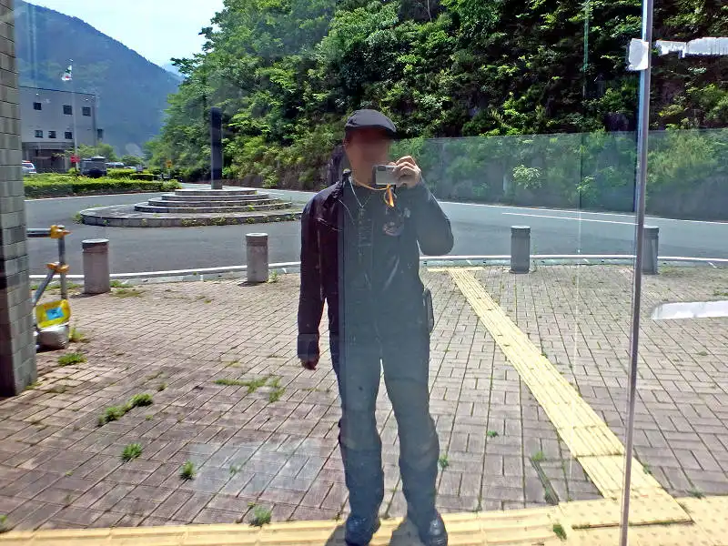 建物のガラスに写った自撮りで、今日の服装をチェック。 もう真夏用のメッシュジャケットの下はTシャツ一枚でも暑いです。