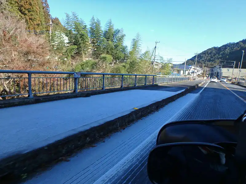 それでも下名栗の方までやってくると山かげのところはご覧のとおり歩道も路肩もまっしろ。