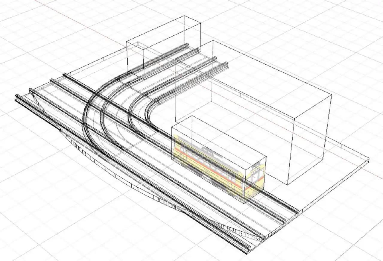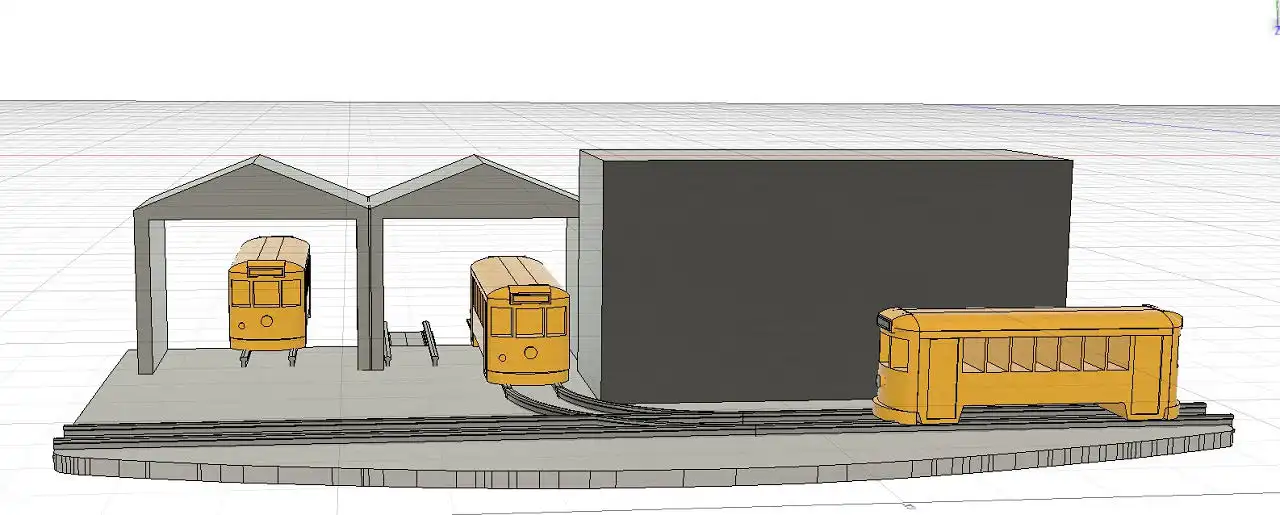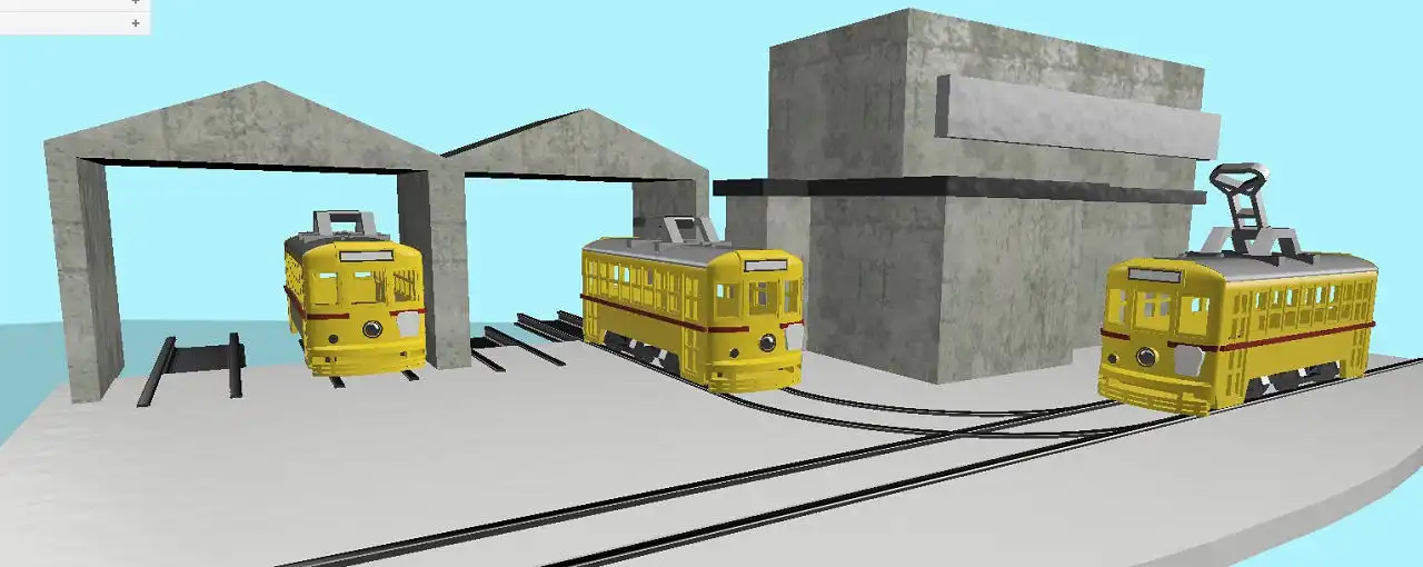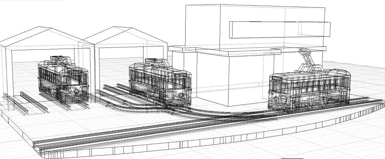 実際にはありえませんが単線にして奥の待機所には倉庫を二棟、四両の都電を配置するようにしました。