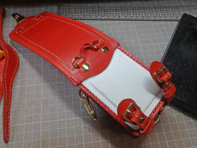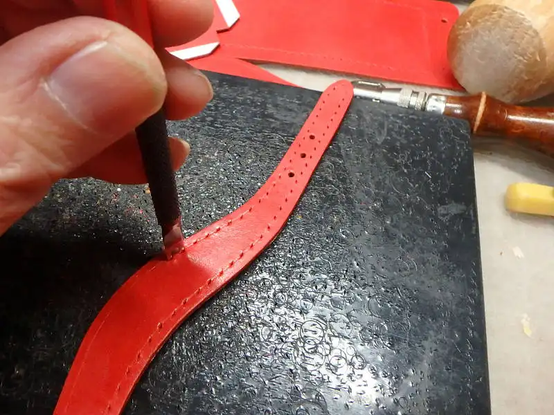 制作は赤い革に型紙を写して裁断するところからはじめました。