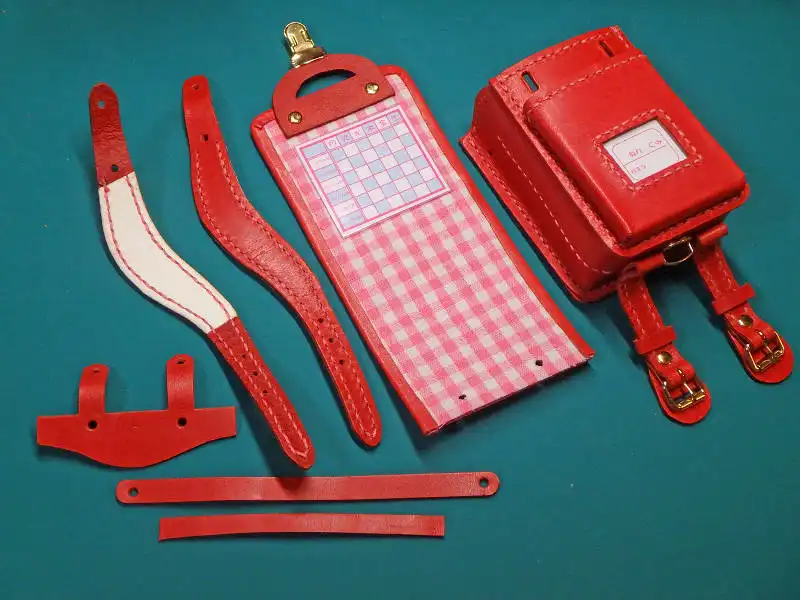 肩ひもの裏側にも白い革を、背革の内側にはチェック柄の生地を貼り、名札や時間割は差し替えできるようにしてあります。