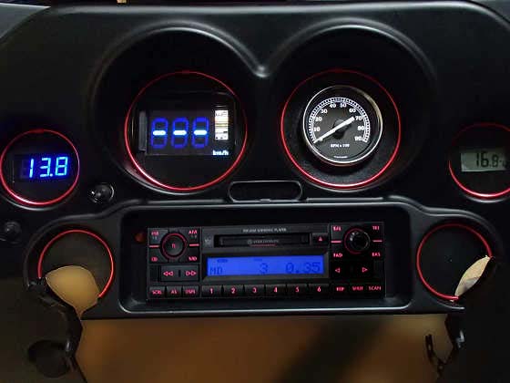 このインパネには、タコメーターのほかにクルマ用のGPSレーダー探知機(普段は待ち受けとしてデジタルスピードメーターを表示)、デジタル時計、デジタル電圧計、デジタル温度計を組み込んでいます。