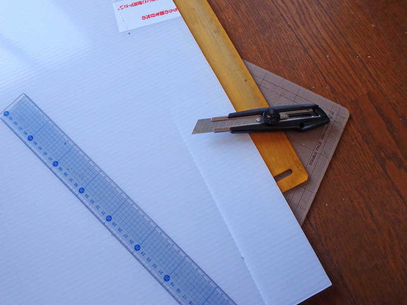 中空ポリカボードをカットします。 こちらはのこぎりを使わずに大型カッターでカットします。 のこぎりだと切りくずがボードの中に入り込んで汚くなるし、カッターでカンタンにカット出来ます。