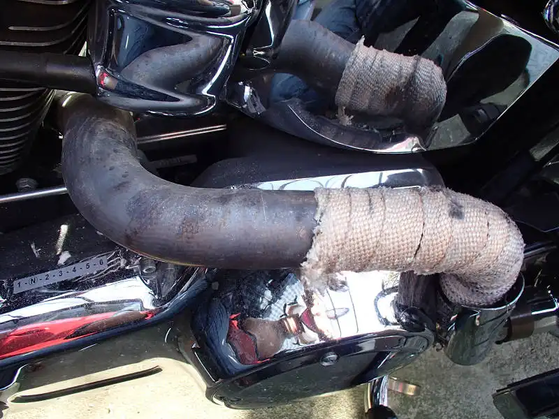 話しを戻しますが左右出しにしたため、エキパイがグニャッと曲がって取り回ししているのでエキパイのところにサーモバンテージを巻いてみました。