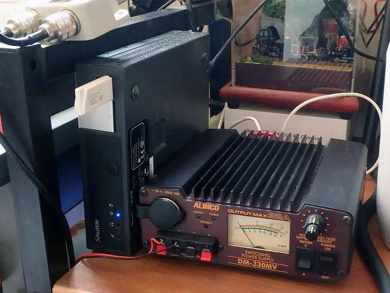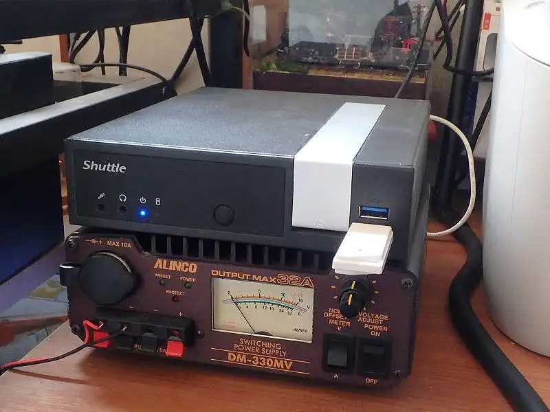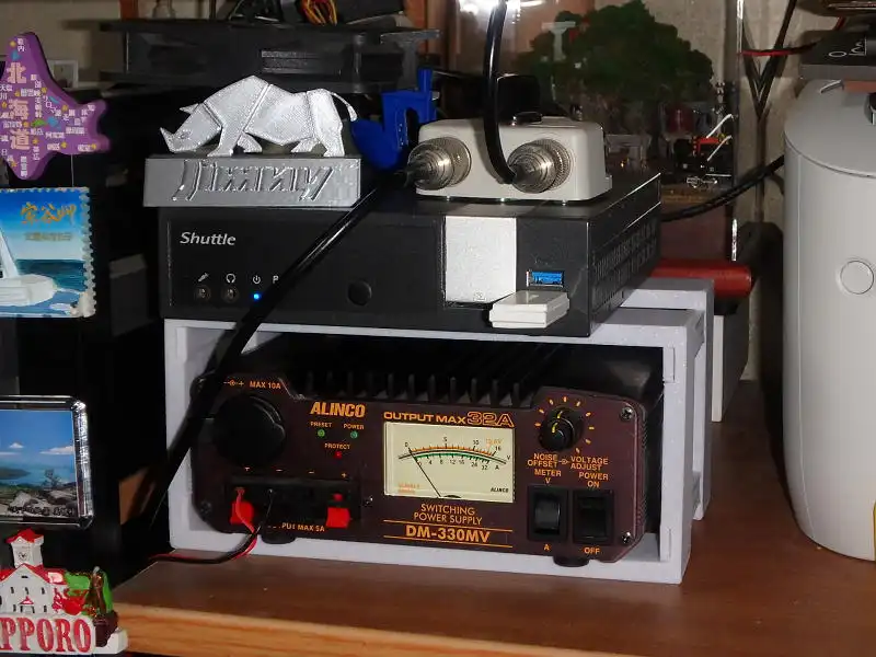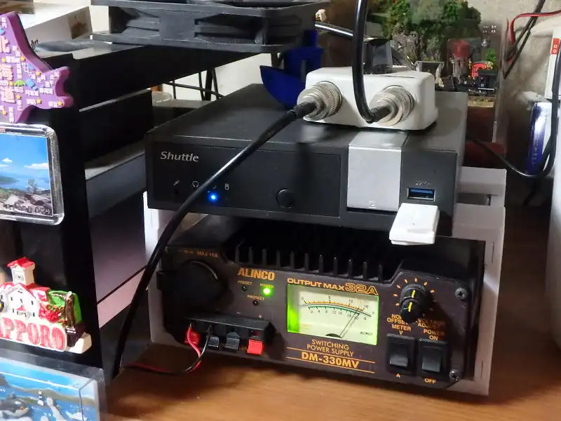 デスクの上に設置している自宅サーバー機とアマチュア無線の安定化電源を並べて使っていますが、広くないデスクの上で無駄に場所を取っています。