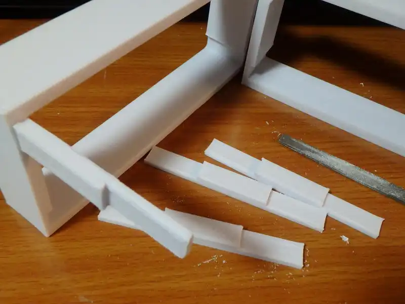 設計図ではうまくはまるはずでしたがどうしても誤差が生じるのではめ込めるように一部をヤスリで削って組立てます。