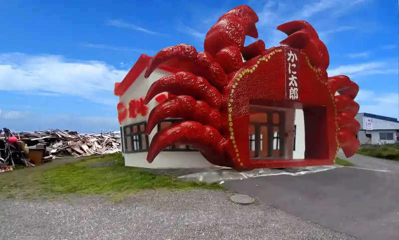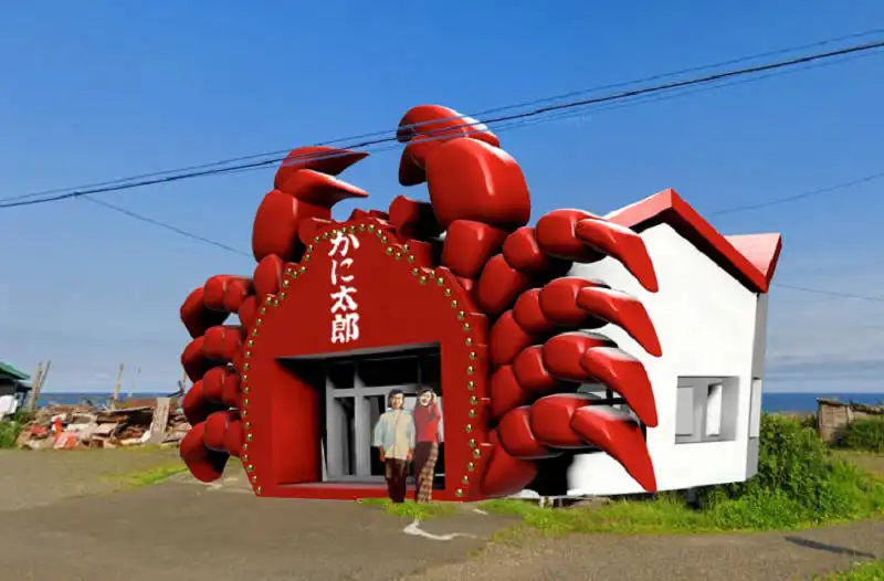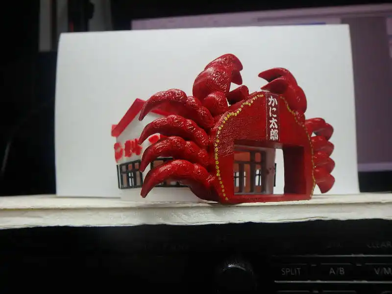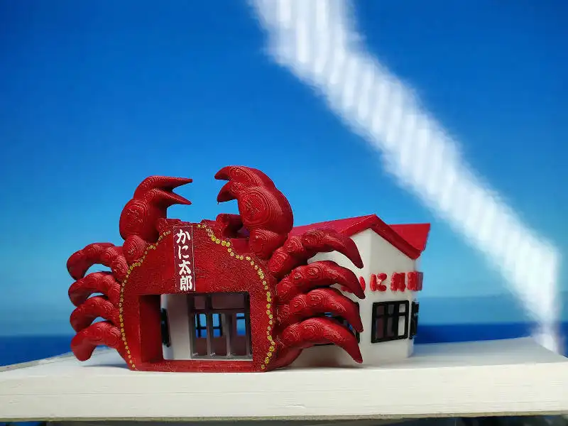 今年のはじめから制作してお店とコラボさせてきましたが、いままでつくってきた3Dデータの画像や3Dプリンターで作成したジオラマ模型を使って、実際のかに太郎さんのお店に、昔あった大きなかにのゲートを再現してみました。
