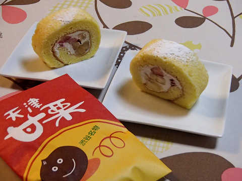 今日の食後のデザートは、妻のお手製フルーツたっぷりふわっふわのロールケーキと私が買ってきた天津甘栗。