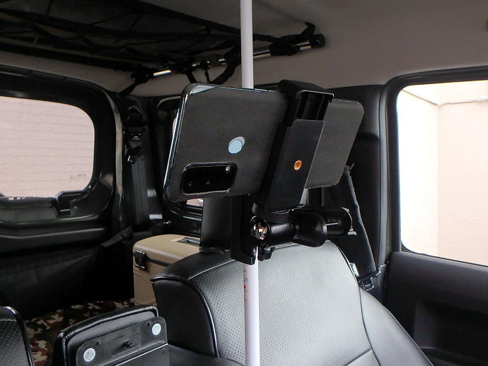 設置してあるのはジムニーに後づけしたアームレストの中から天井に突っ張っています。