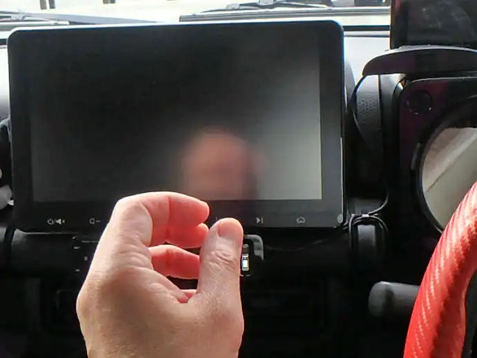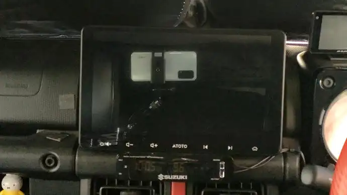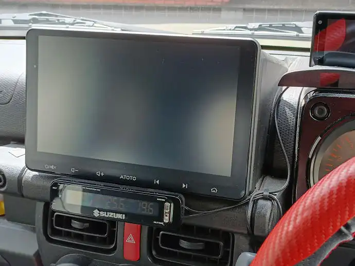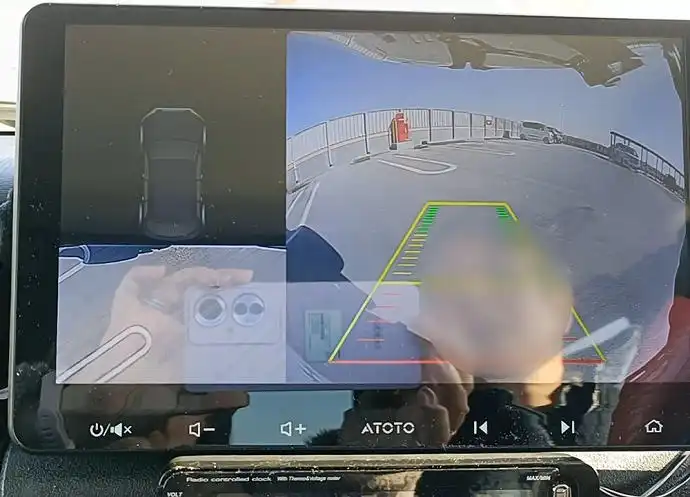 このディスプレイオーディオはATOTOの10インチS8Proモデルですが画面は光沢(グレア)タイプなので撮影している本人(右)の顔と助手席でスマホを持って撮影している奥さんの様子が映っています。
