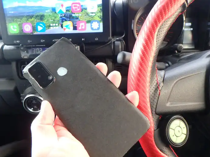 ただこのままだとダッシュパネルまでの距離が近いのとディスプレイオーディオを下から見上げるような角度になるので、もっと近くで上のほうにスマホをセットした方がいいようです。