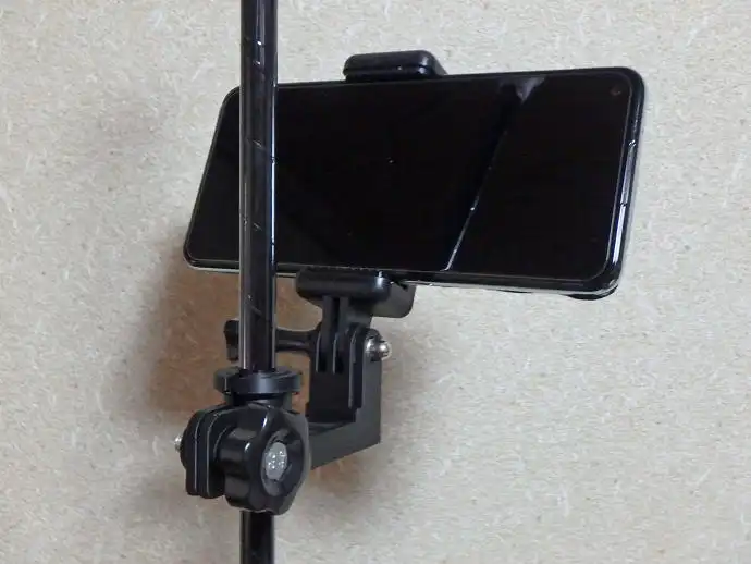 突っ張り棒のパイプを挟んでネジで締め付けて固定、スマホはGoProのスマホ用ホルダーを取付けます。
