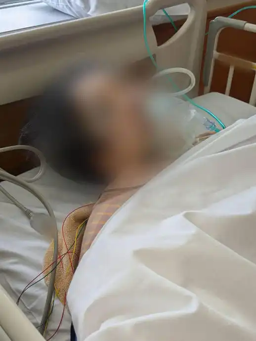 点滴チューブのほかに鼻には酸素マスクと内臓の内部から排出する管、胸には心電図モニター、指に酸素飽和度測定機、おしっこの管も挿入され両足にはフットポンプが装着されて体の自由がまったくききません。